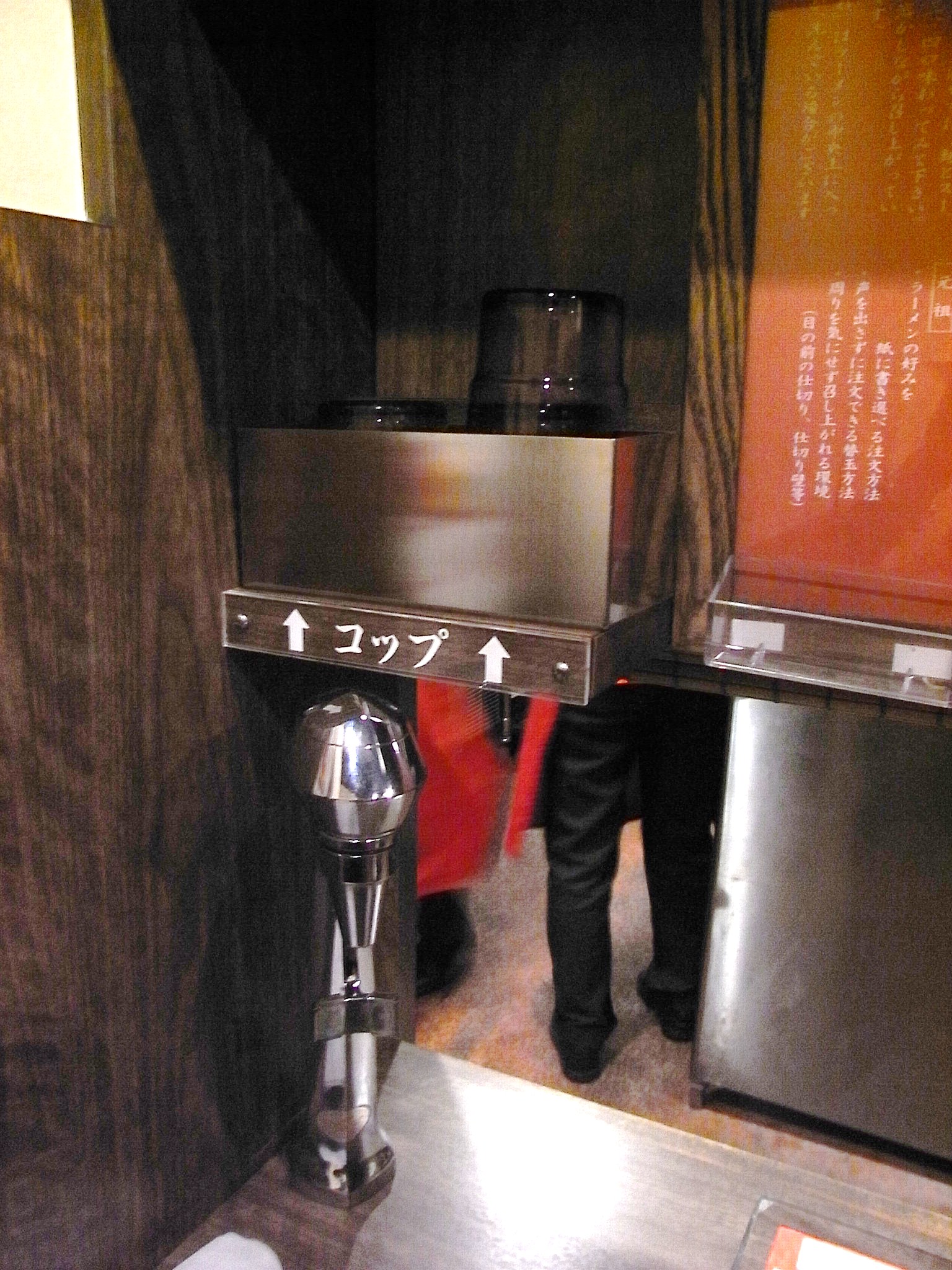 Well, speak more about Ichiran ramen restaurant, the biggest feature is the table. Ichiran has obtained a patent for the table style, which they call "aji shuchu counter" (味集中カウンター = "Concentrate on the flavor" counter). At Ichiran's counter table, unusually each seat is surrounded by walls in three dimension so that each guest can concentrate on enjoying the flavor of ramen. You won't be seen or disturbed by the restaurant staff, nor by neighbor diners, while you are enjoying your bowl of ramen. The high counter with walls seriously reminds us a "voting station"!!