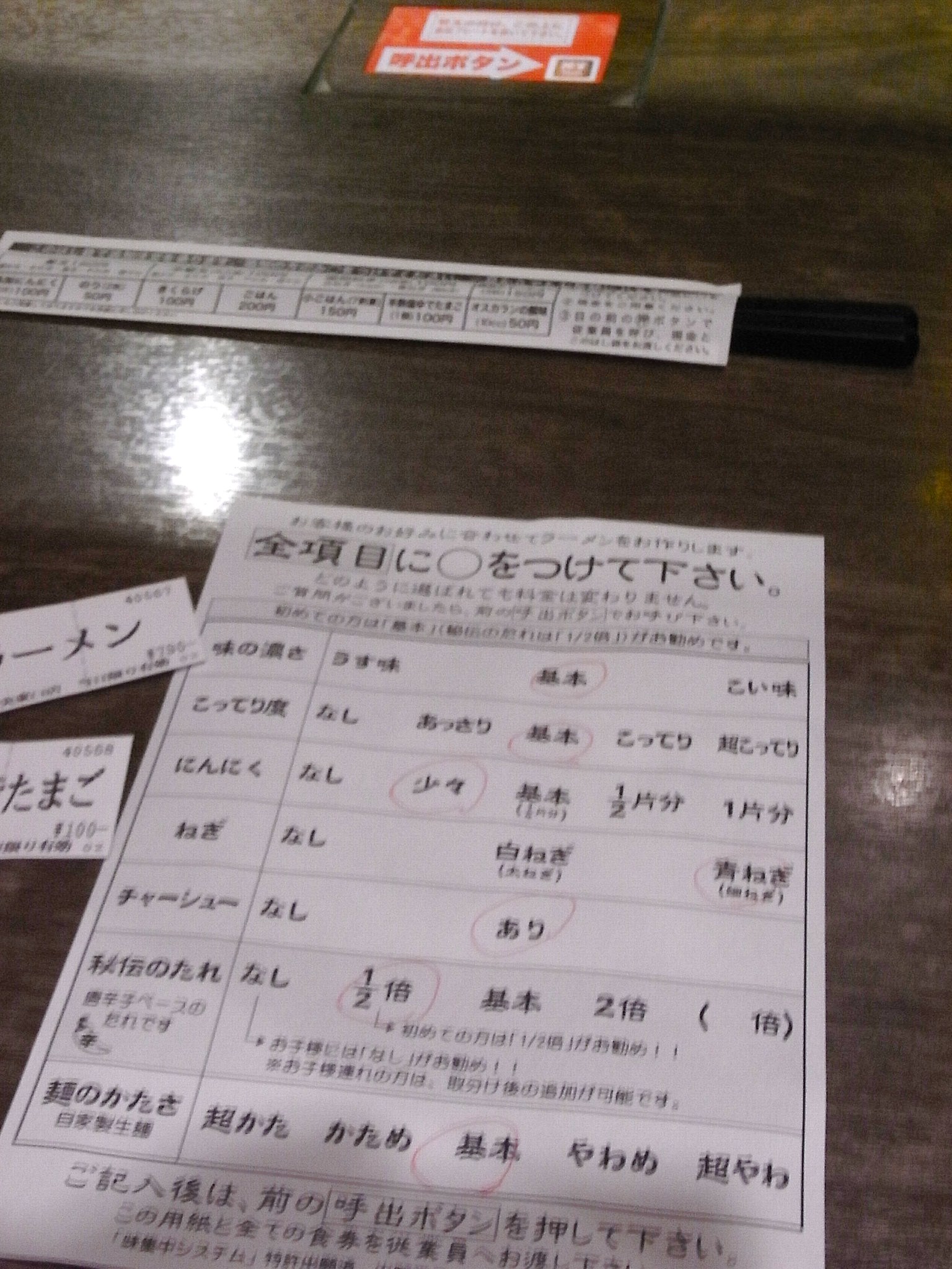 At your "Concentrate on flavor"counter table, fill out a form there for your taste customized, such as taste (mild, strong, soft or rich), volume of seasoning and ingredient (garlic, leek, original hot pepper sauce etc), noddle (how much cooked, hard or soft).